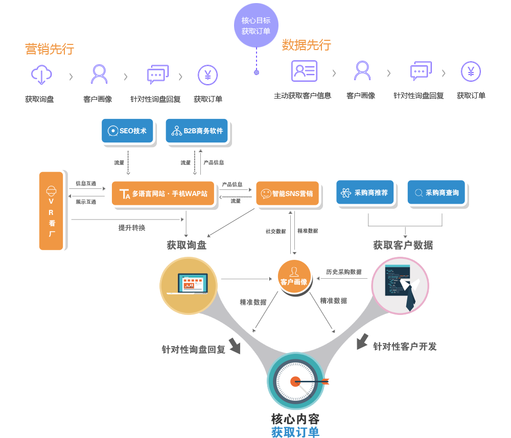 SEO技術(shù)通過搜索引擎為網(wǎng)站帶來流量,網(wǎng)站上展示VR全景看廠提升轉(zhuǎn)化率,產(chǎn)生更多詢盤。對(duì)詢盤進(jìn)行曾經(jīng)采購(gòu)行為分析,客戶畫像,進(jìn)行深度SNS挖掘獲得客戶詳細(xì)情況,并有目的地精準(zhǔn)聯(lián)系,獲得訂單。